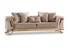 The sofa and loveseat feature a refined, rectangular frame with intricate gold detailing along the base and arms, lending the set an air of classic sophistication. The arms are adorned with a subtle ribbed pattern, adding texture and depth to the design. The high-quality construction is evident in every aspect, from the sturdy base to the finely finished edges, ensuring that this set not only looks exquisite but also stands the test of time.