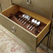 Dine in style with this fabulous Antique Gold finished dining set. Antique mirrors accent the set, adding soft reflections that glimmer in natural light. Cushioned chairs are elegantly detailed with nailhead trim and single tufted accents. Dazzle with the geometrically designed mirror and easily organize dinnerware with the dining server. Intricate and opulent, this dining set provides comfortable seating with an expandable leaf that ensures plenty of space for everyone.