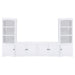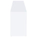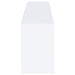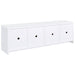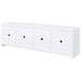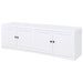 Create plenty of storage to accompany your large screen television with this modern TV stand. Designed to host a TV up to 85 inches, it's a long, linear structure with clean, precise lines that blend into most spaces. Its neutral finish complements melamine surfaces that add durability, perfect for a family living space. Four doors open to reveal interior shelving that's adjustable and includes cord management openings for easy organization of media and gaming components. Use the added shelving for accessories and media in your tidy, organized space.