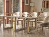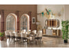 Dimensions: Dining Table (6) Width: 79" Height: 31” Depth: 39" Dining Table (8) Width: 94" Height: 31” Depth: 43" Dining Table (10) Width: 102" Height: 31” Depth: 43" Dining Table (12) Width: 130" Height: 31” Depth: 43" Dining Chair Width: 22" Height: 35” Depth: 20" Consol Width: 82" Height: 32” Depth: 19" Mirror Width: 66" Height: 2” Depth: 35"