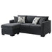 Refresh your living room or den with the contemporary style and easy versatility of a modern sleeper sectional sofa. Lending flexibility to your space, it boasts a chaise lounge for easy relaxation and expands to create a bed when overnight guests arrive. Its soft, inviting upholstery complements foam cushions and spring decking to create excellent support. Gently rounded track arms add a touch of character to a streamlined silhouette and block feet create stability. Four accent pillows add geometric prints to the ensemble, perfect for a contemporary living space.